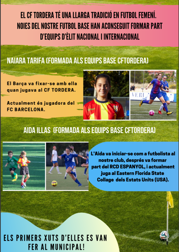 De la base de futbol femení del Club Futbol Tordera ha sorgit molt de talent. Exemples com la jugadora del Futbol Club Barcelona, Naiara Tarifa, o l’ex-jugadora del RCD. Espanyol i actual futbolista a Estats Units, Aida Illas.